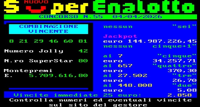 Scritto il 4 Aprile 20264 Aprile 2026 Pubblicato inSuperenalotto Superenalotto di oggi, 4 aprile 2026: i numeri vincenti del concorso n.55 Il SuperEnalotto è un gioco d’azzardo, legale, a premi gestito dalla SISAL. Fu introdotto in…